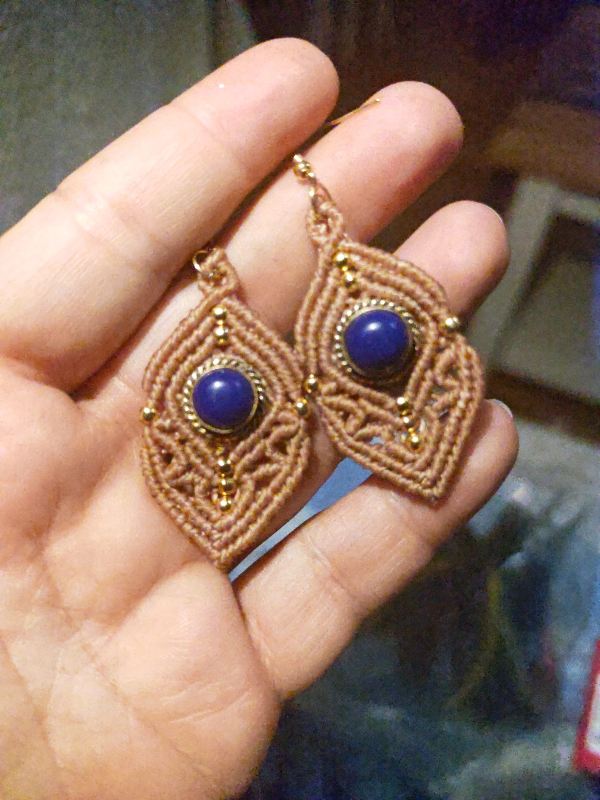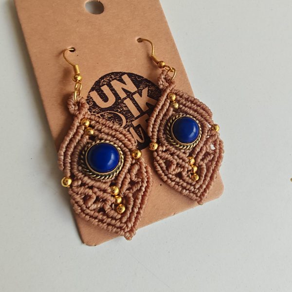 Unikatni, viseči, ročno izdelani uhani v mikromakrame tehniki. Uhani so okrašeni z medeninastimi perlicami in poldragim kamnom lapisom vpetim v medeninasto posteljico.