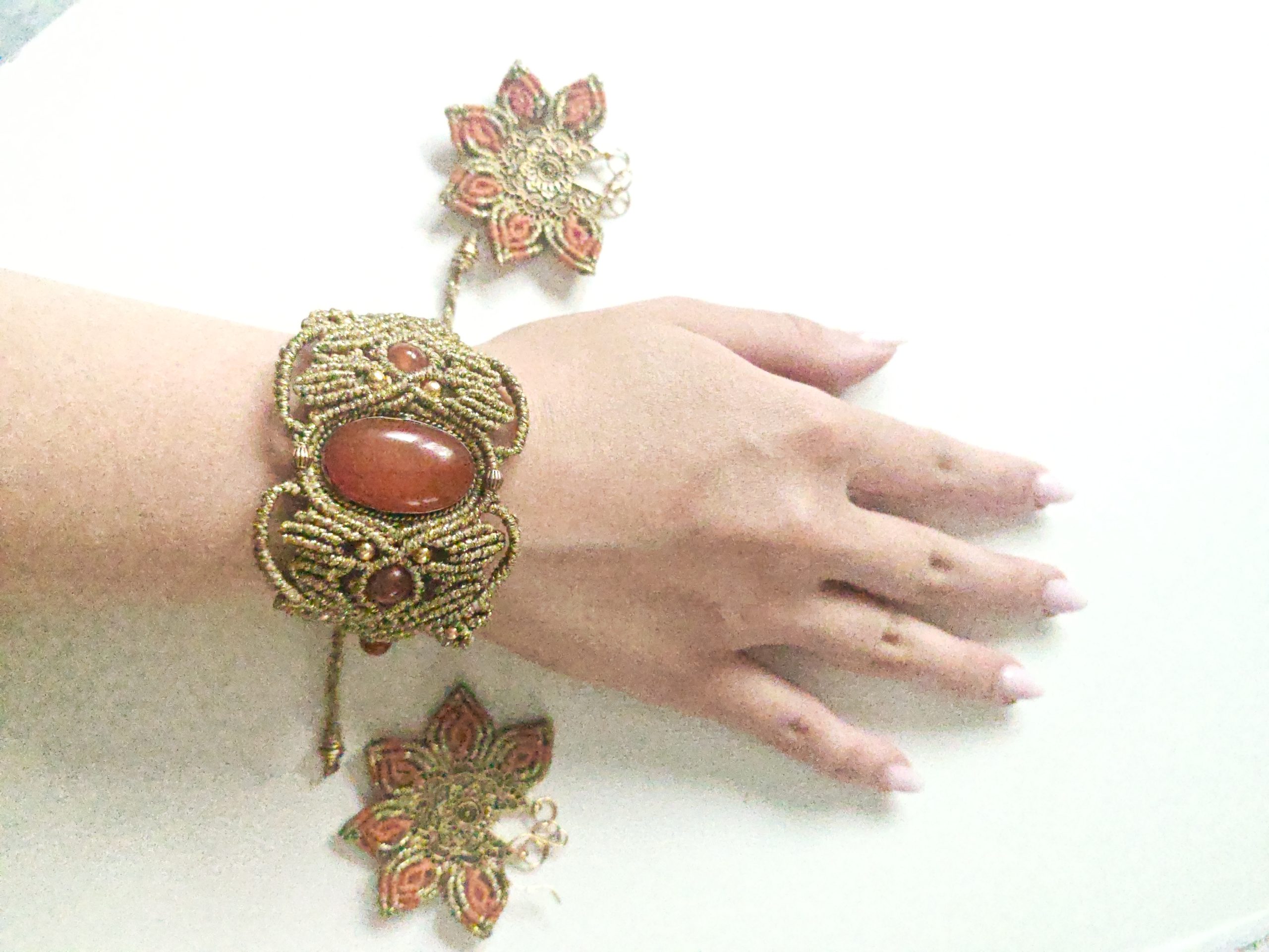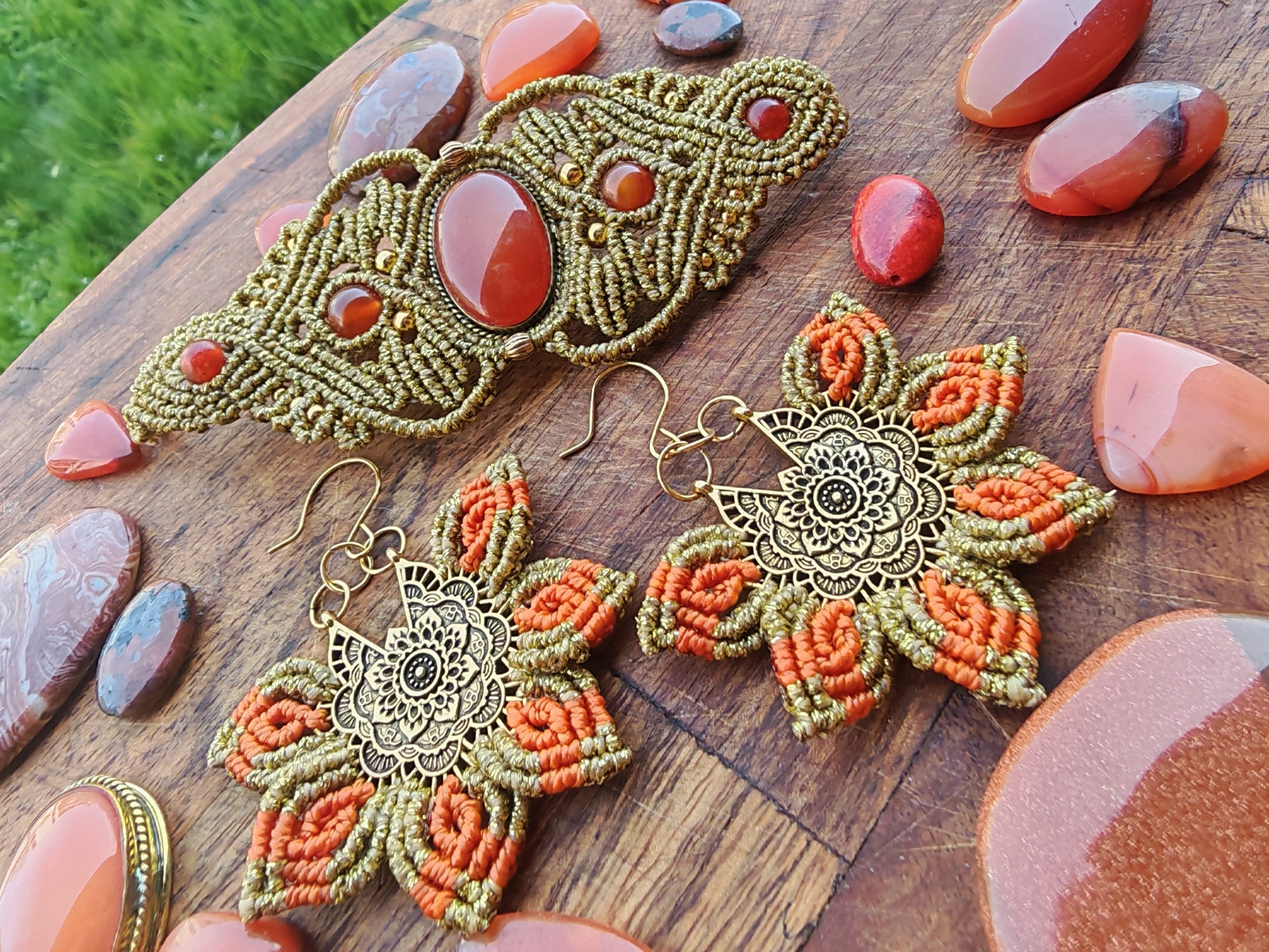 Unikatna, ročno izdelana zapestnica v mikromakrame tehniki okrašena s poldragimi kamni. Bistvo zapestnice poudarja karneol v rdečeoranžnih odtenkih vpet v zlato mrežo vozlano iz trpežne makrame vrvice. Izdelek je odporen na vodo in univerzalne velikosti.